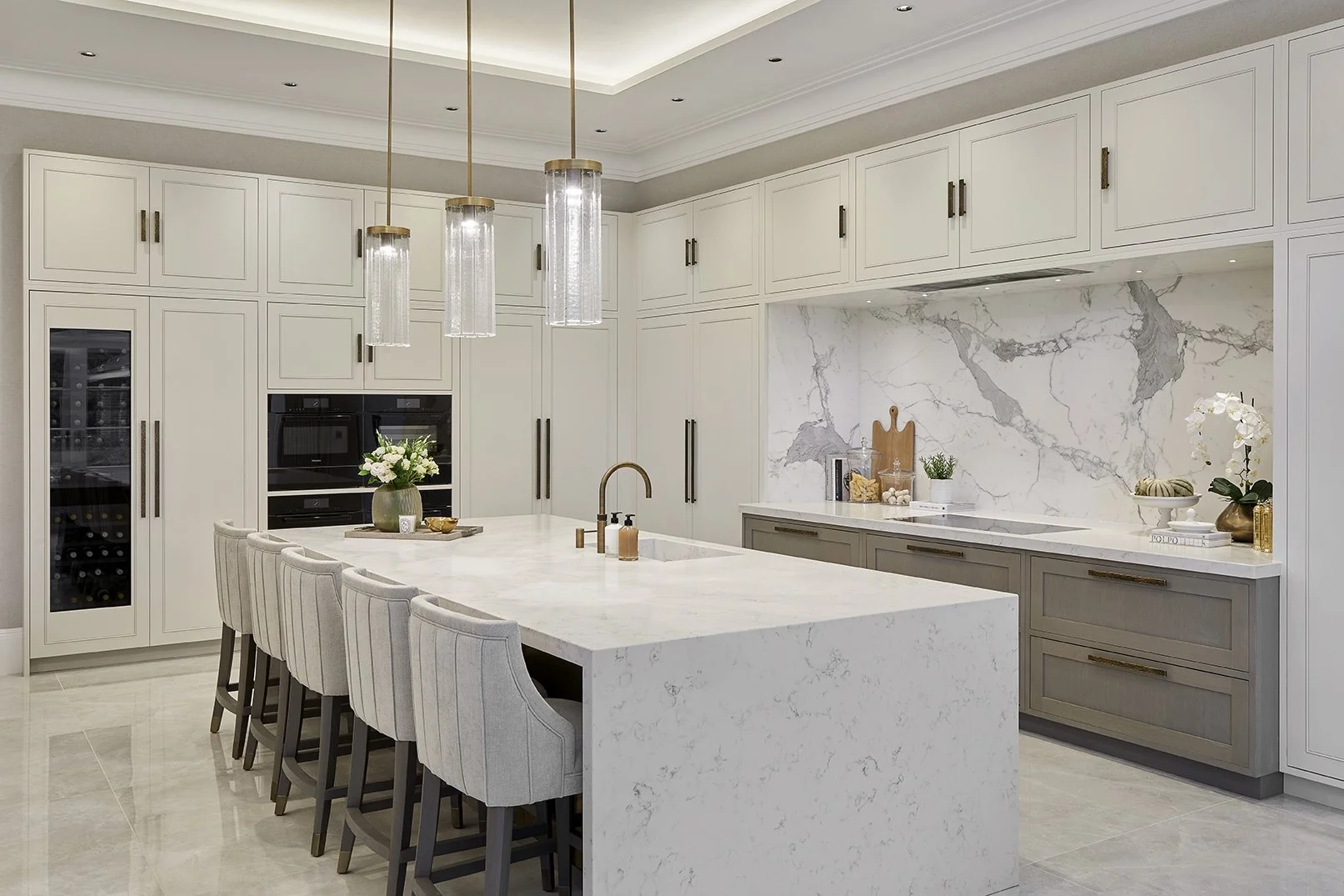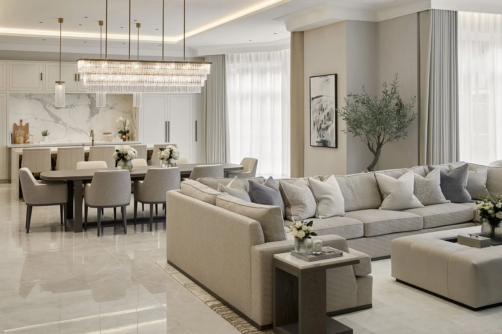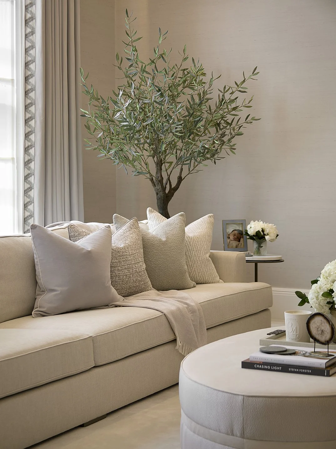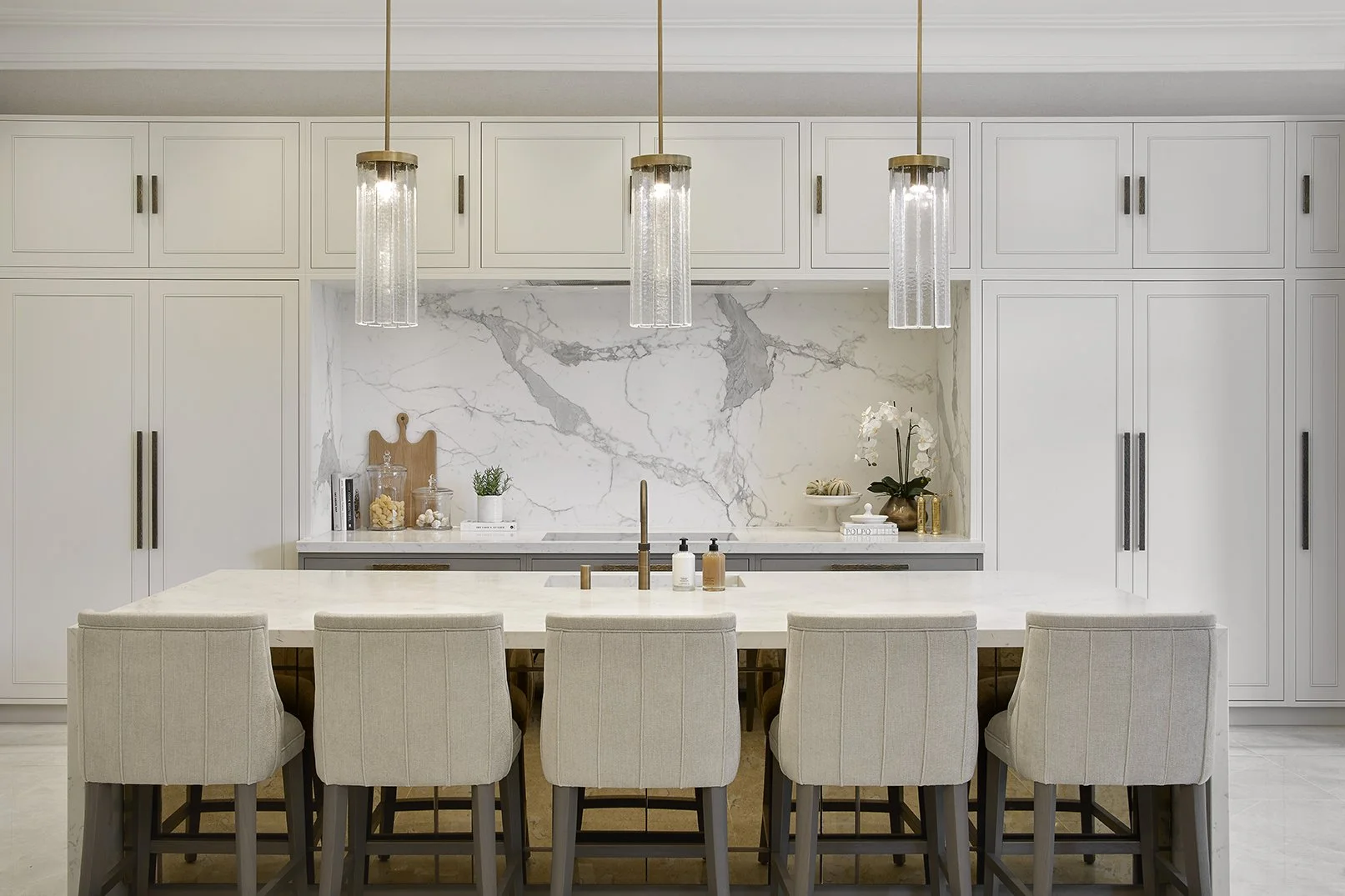 We reconfigured the internal layout during construction to improve flow, functionality, and family living. A carefully considered material palette of high-performance fabrics, durableporcelain surfaces, and bespoke joinery created a timeless yet practical interior. Custom upholstery, commissioned artwork, and curated accessories completed a cohesive and highly personal home.
